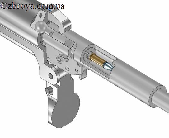 Продолжая описание конструкции комбинированного топора для выживания в экстремальных ситуациях, рассмотрим работу малокалиберной винтовки, входящей в состав этого изделия.